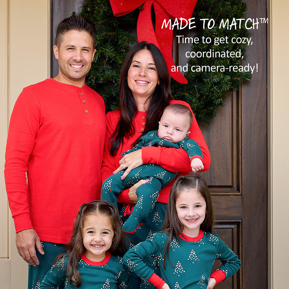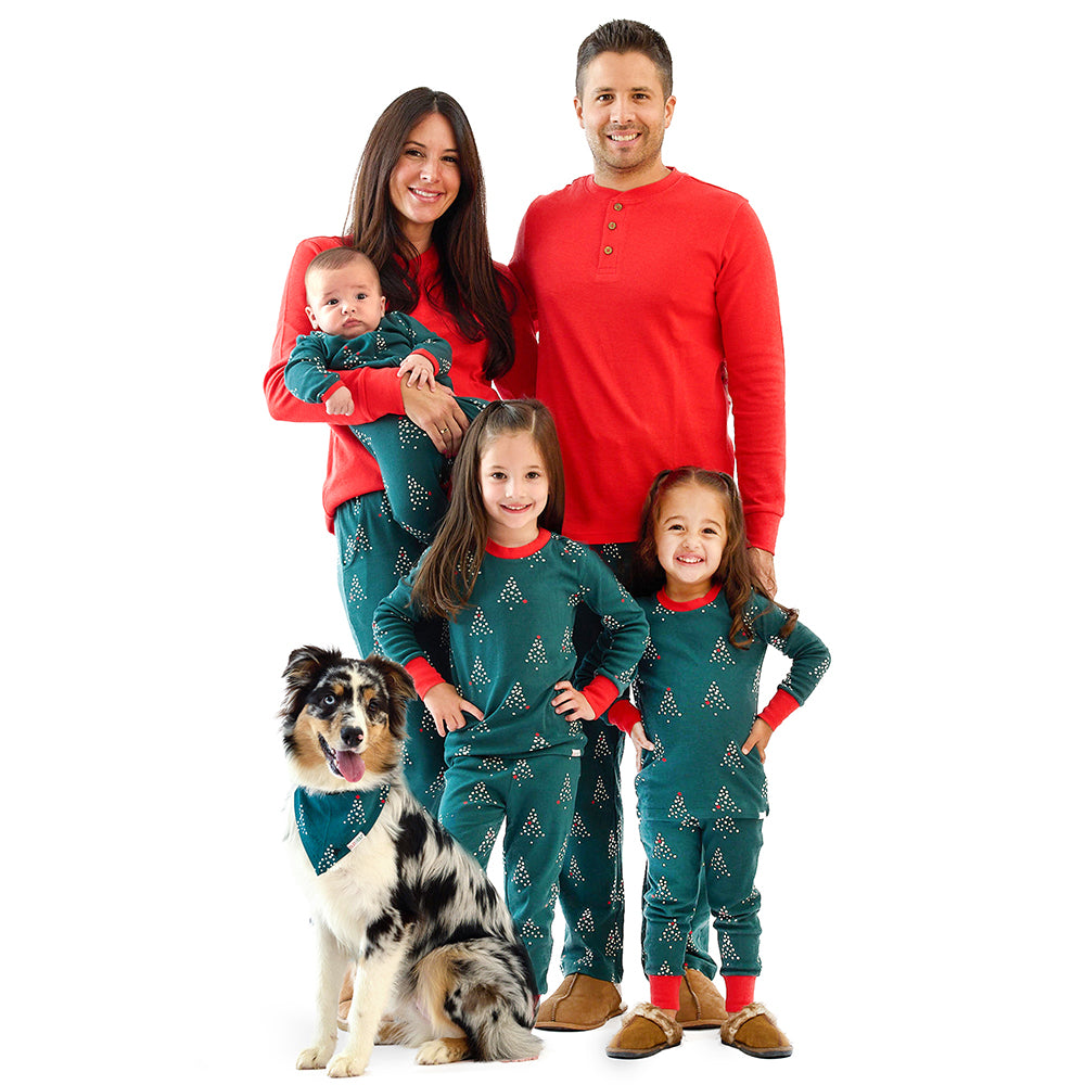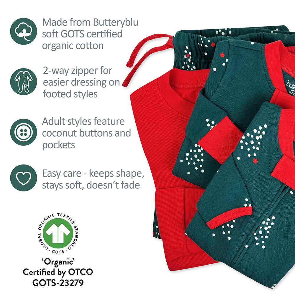 Butterblu Matching Family Jammies are made from unbelievably soft, GOTS-certified organic cotton. We believe every member of the family (pets, too!) deserves cozy and snuggly, comfortable PJs, so we made these festive holiday pajamas in sizes newborn through adult. These PJs are super-comfy, picture-perfect, and made to wash like a dream. Time to snuggle in and get cozy and coordinated—those holiday cards don’t style themselves! Available for Babies (NB-24M), Toddlers (2T-7Y), Kids (8-14), Mens and Womens (XXS-XXL) and Pets (XS-L).